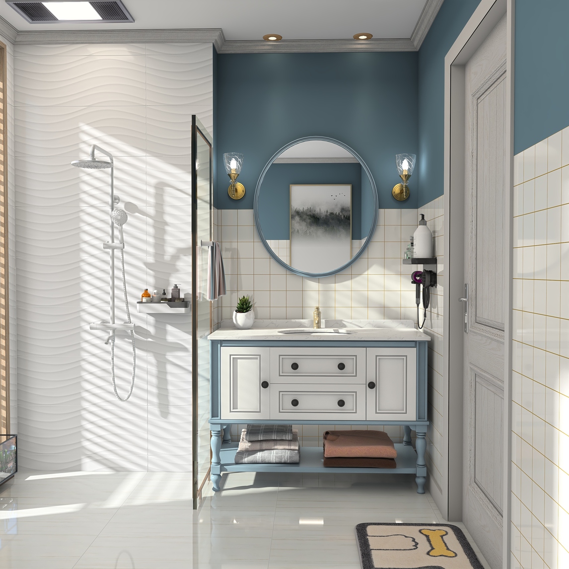 波浪瓷砖蓝色地中海梦幻风格浴室间,精致毛巾挂免除麻烦,多用途双色浴室柜组合毛巾换洗一拉搞定,收纳空间不浪费
