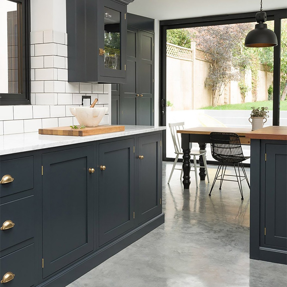 田园风厨房比较适合半开放式设计,将餐厅与厨房连接在一起,在扩大空间的同时还能显得更温馨。厨房地面灰色地砖与墙面白色小方砖形成了一定的对比,在视觉效果上反而增添了一丝清新自然。