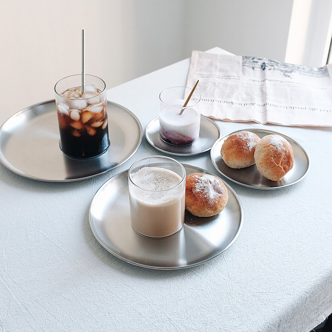 磨砂质感的不锈钢圆盘,不同的尺寸,可以满足日常的不同需求,可以做餐盘,甜品盘,甚至托盘,多功能,很百搭。