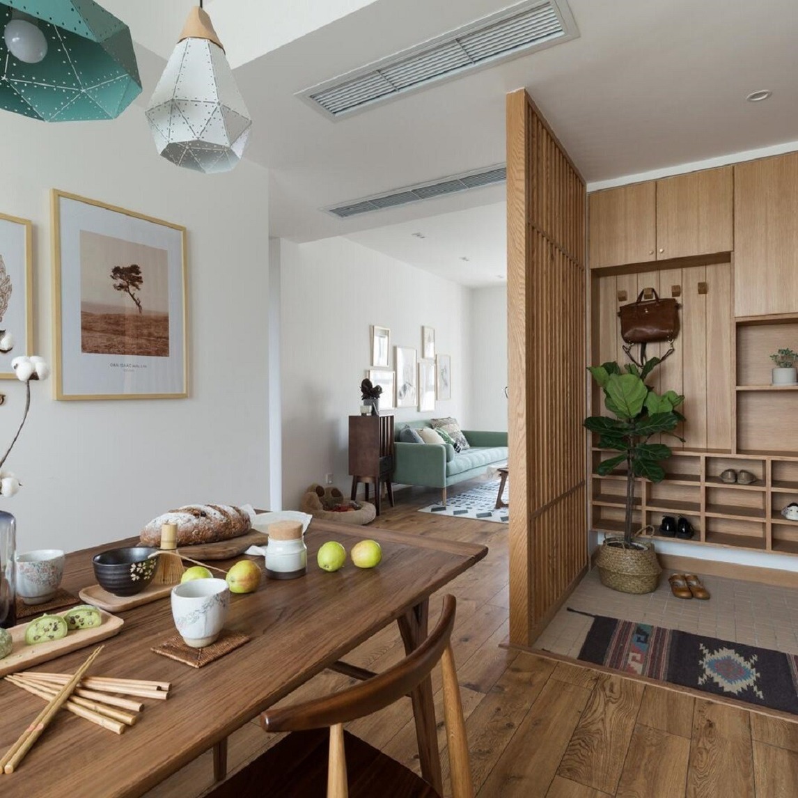 之所以在餐厅里融入绿色元素,是因为绿色能让空间显得更具张力和可拓展性,同时它对人的食欲也可以起到一定的促进作用。浅棕色餐桌与绿植的风格进行了充分的融合,留白风格的装饰画则让总体设计显得更为简约。