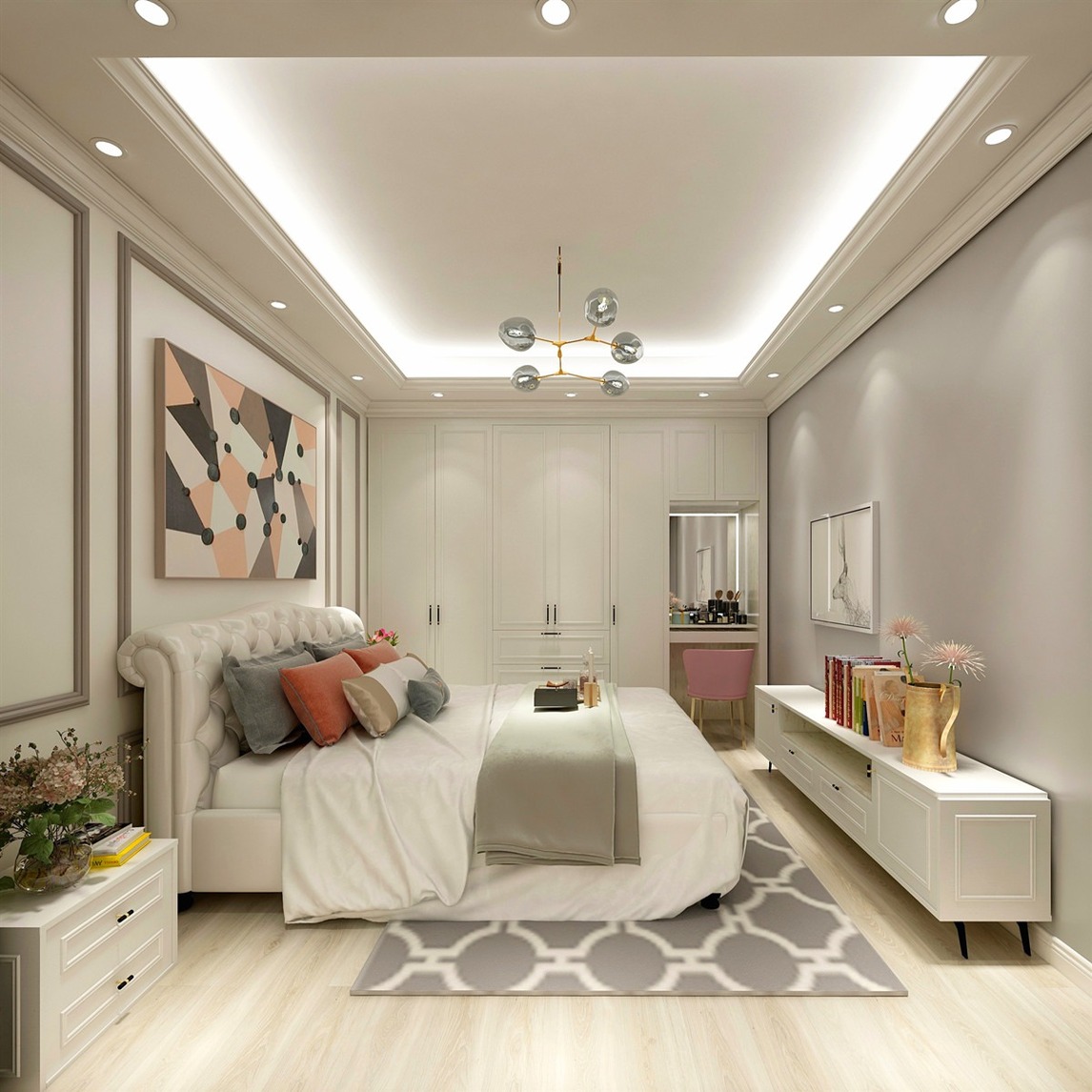 法式风格,衣柜优雅框线设计,色调内敛迷人,带梳妆台,整体感强。室内搭配艺术画,装饰花卉,原木色地板,简约灯饰照耀下更显格调,筒灯、灯带作为补充光源。