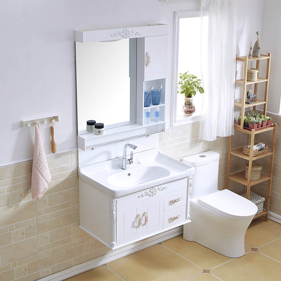白色系浴室柜与棕色系瓷砖代表着完美的线条,可以起到分割浴室空间的作用,也使欧式的古典简约相互融合。另外,浴室还添加了白色马桶,借由明快跳跃的色彩运用,让浴室的立体空间感也变得强了。