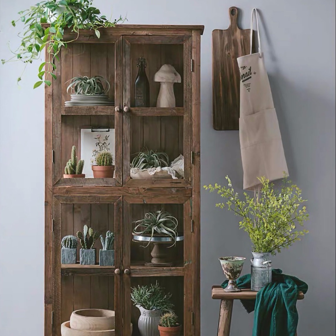 把植物都放进柜子里,像展品一样的收装起来。有点萌,有点生动。作旧的实木玻璃柜,最大化的还原了自然的气息,把它放在客厅的一角,做一个与众不同的收纳家。