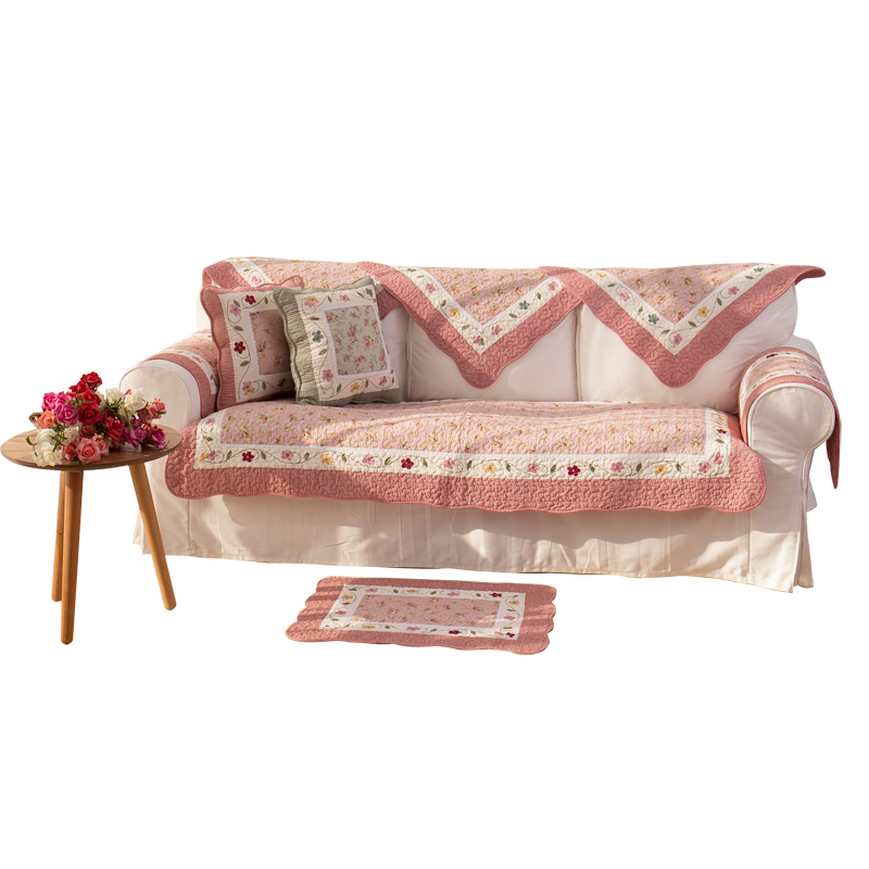 田园纯棉绣花四季沙发垫,纯棉可机洗无静电,唯美绣花工艺,纯棉布透气舒适,传统绗缝拼布设计, 韩式田园风,刺绣小花点缀,低调唯美!