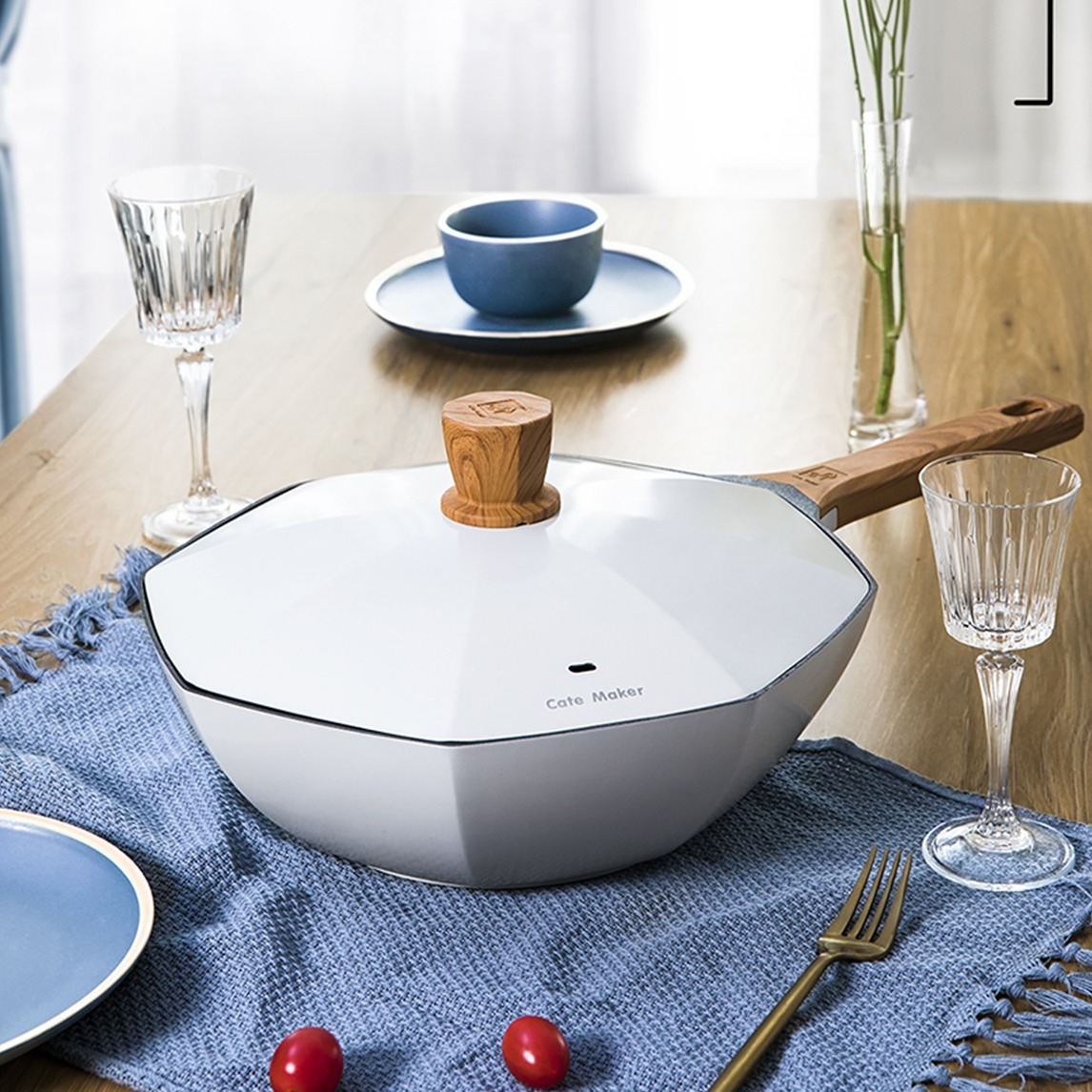 德国红点奖设计师作品,源于欧式八角屋建筑标志,八角面体钻石黄金分割,采用陨晶涂层航天材质,高密度表面,分割食物与锅面的接触面积,达到悬浮式不粘