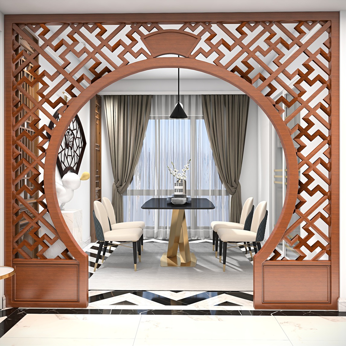 民以食为天,餐厅的舒适尤为重要,餐厅的撞色与客厅遥相呼应,为餐厅增加活泼感,促进食欲。简洁的吊顶不失造型感,又显空间感,浅色调的餐桌椅增添家的温馨感。