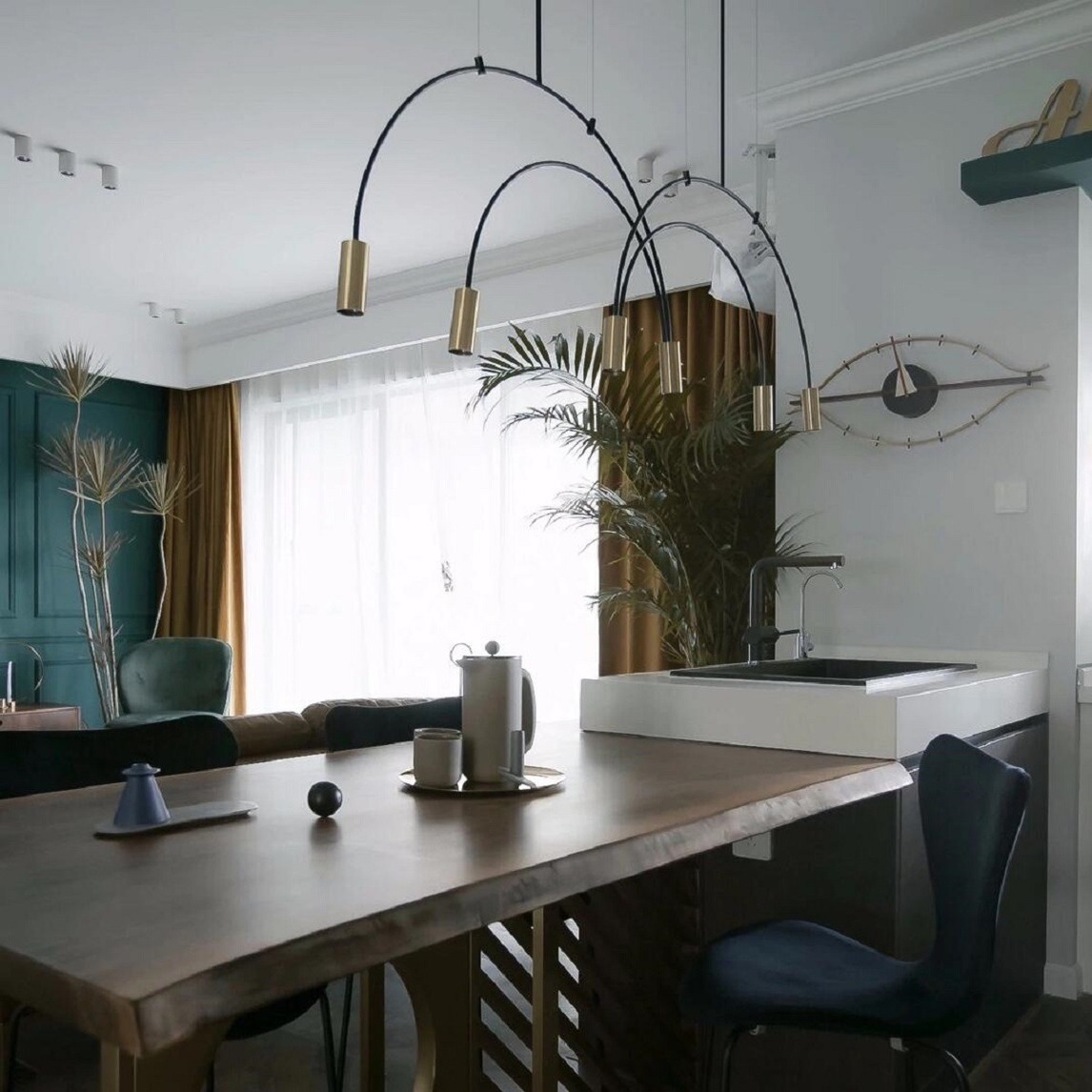 客厅采用了木制桌子与灰色墙面的搭配,同时,餐桌四周的布艺座椅还能让房间散发出简约而复古的气息。鎏金风格的不规则吊灯可以填充客厅的上层空间,纯色的瓷器则起到了画龙点睛的装饰作用。