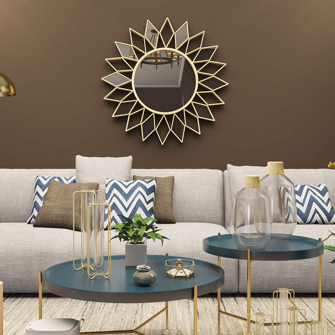 整个空间根据色块分为上下两部分,棕色与米色,看似泾渭分明,通过墙上和桌上的金色金属元素又相呼应,整体保持了色调的和谐,打造了现代简约风格的客厅。