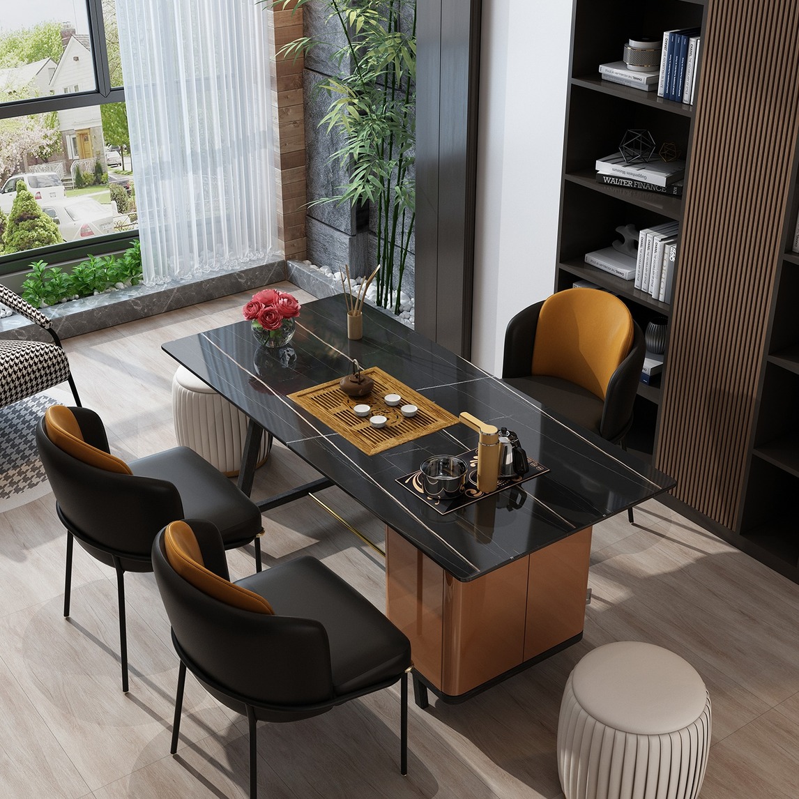 多个单元组合而成,打造出超有美感的新中式书房~ ● 选择一款新中式茶桌来营造整体风格,劳伦黑金的大理石台面搭配鸡翅木茶盘就已经足够吸引人了,再结合智能电茶炉和USB接口,凸显出古典与现代的高度融合; ...展开
