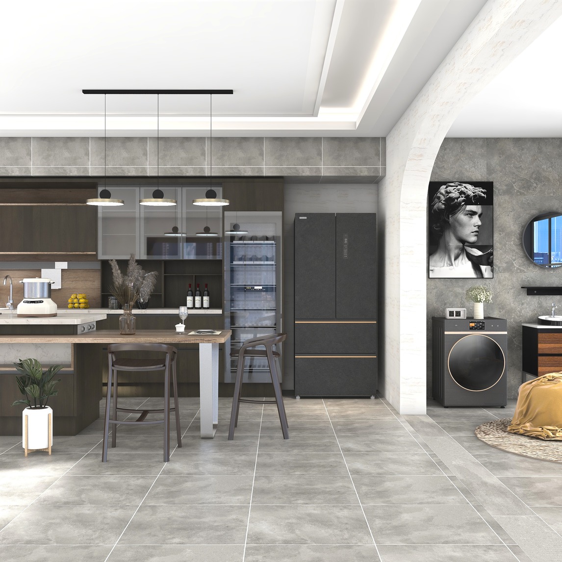 用灰色大理石纹路打造的开放式厨房,自有一股简约质感,搭配黑白色的画作和棕色系的家具,酷感十足。COLMO熔幔岩冰箱和星泽灰洗衣机,低调奢华的质感提升了厨房的时尚度,高端家电的强大功能,帮助每个家庭开启...展开