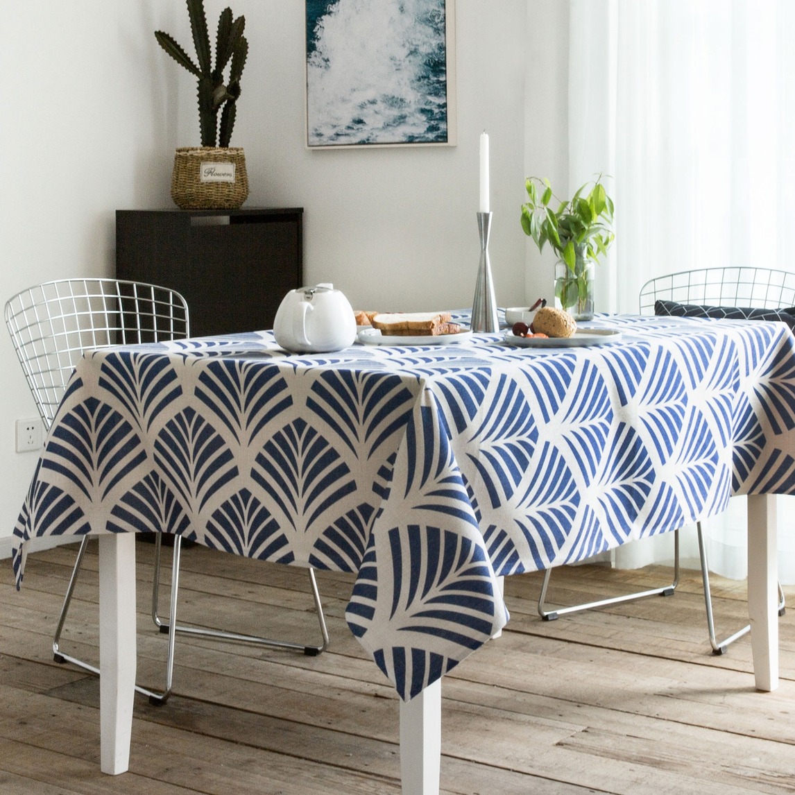 清新系的餐厅搭配,选用了纤细的北欧风餐椅,然后搭配上有着浓郁和风图案的餐桌布,是非常养眼的素美又优雅的混搭。