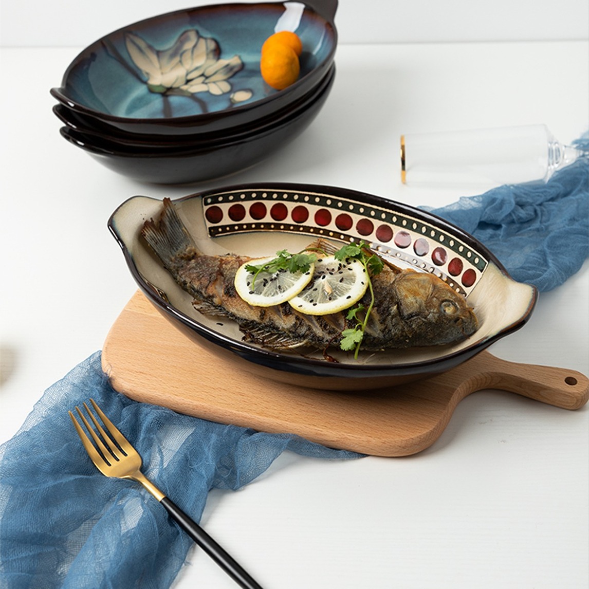 复古异域风情的复古风餐厅,独特的手绘陶瓷蒸鱼盘,搭配窑变釉陶瓷工艺,色彩的变幻更加莫测,让用餐变得更有仪式感。