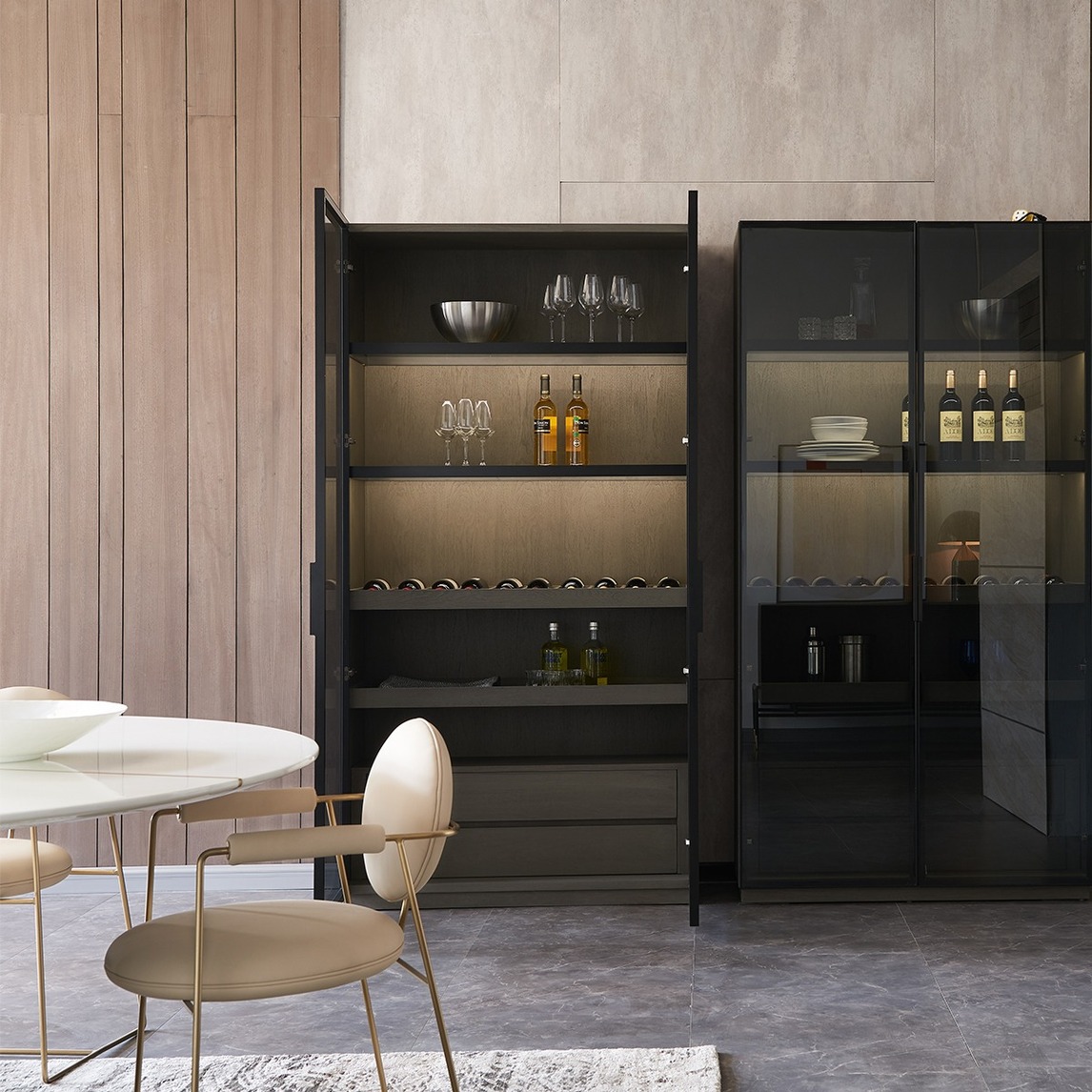 轻奢家具的好处在于,高颜值,所以几件家具就可以轻松将空间装点出丰富的层次与质感。 自带灯带的玻璃门酒柜,公主风极简餐椅,无一不精,无一不美。