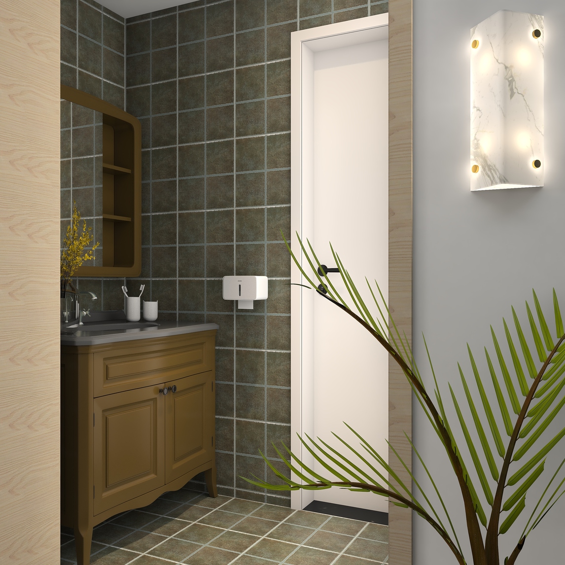 复古绿色在干区的呈现,搭配复古深色的洗手柜,营造了纯正的美式风格,将休闲与自然的风格引入空间更加的时尚。
