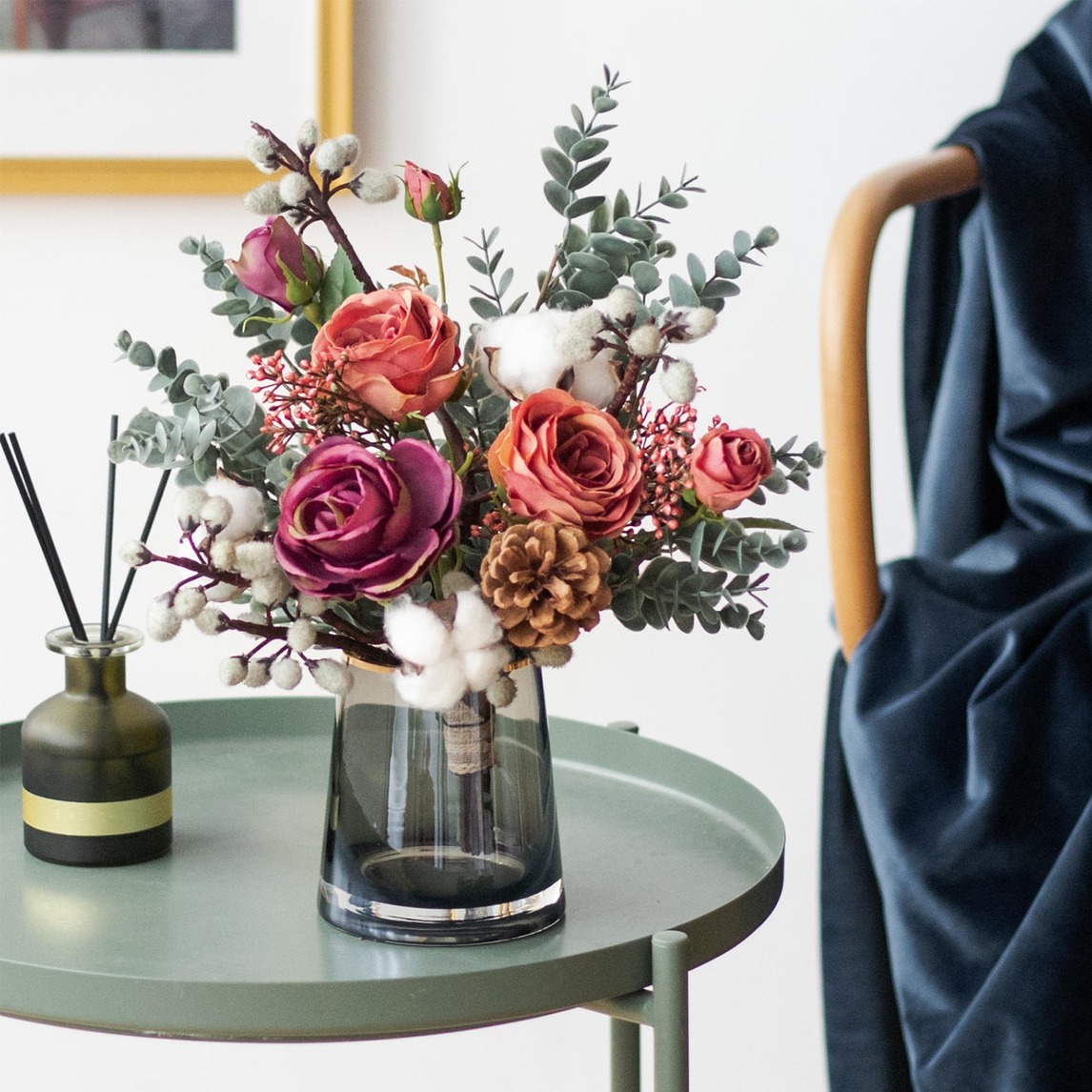 非常钟爱宜家的这款墨绿色圆形边几,可以很好的融入任何环境。摆放上一束秋色系仿真花束,能够和旁边藏青色盖毯形成很好的颜色碰撞。再选一瓶同样墨绿色系的香薰搭配在一起,复古又浪漫的边几就出来了~