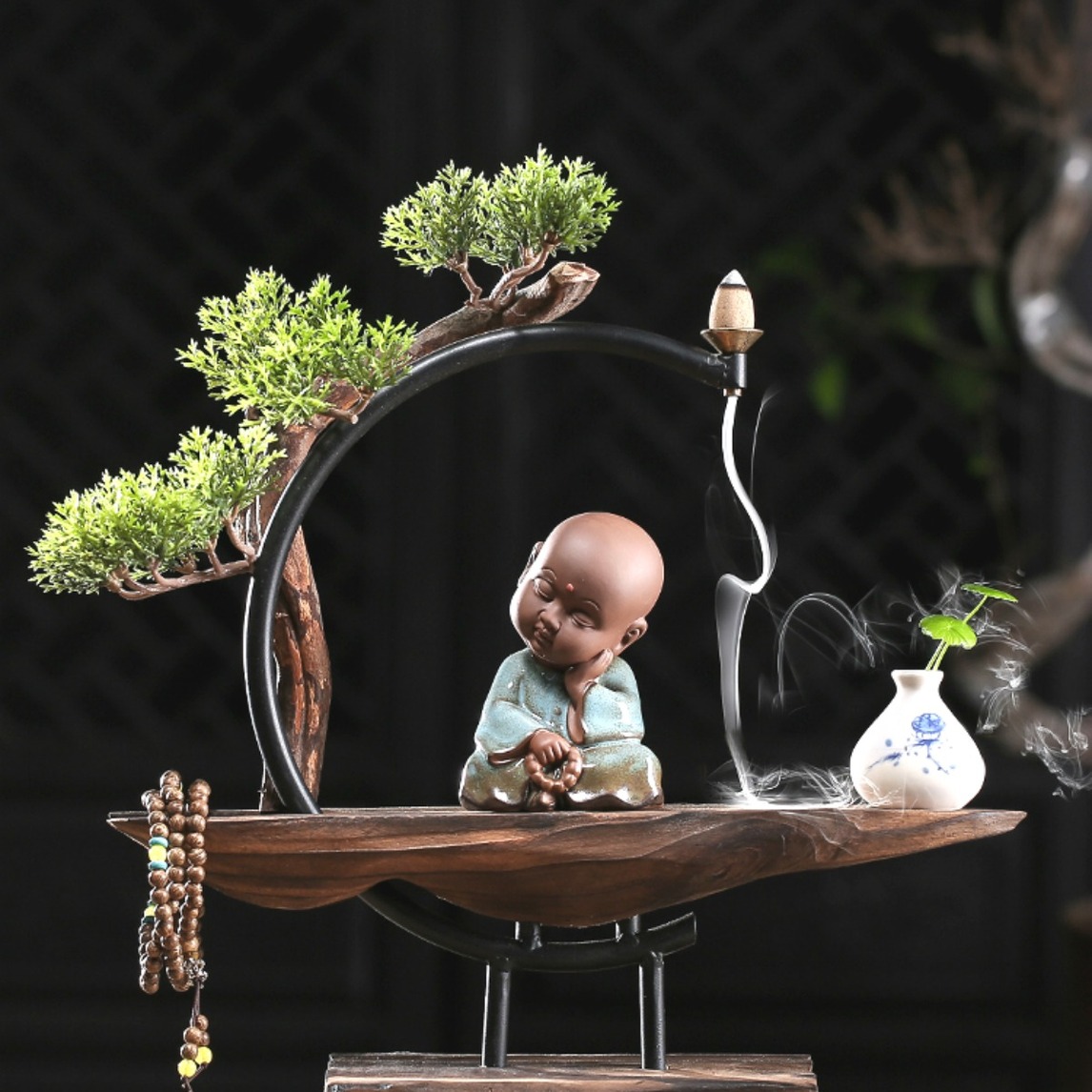 金属香托使用安全,仿真绿叶绿植,给空间增添一丝丝绿意,紫砂材质塑造的人物五官刻画细腻,栩栩如生,倒流香细烟如潺潺流水,烟雾灵动缥缈,给家里增添一丝宁静之感。
