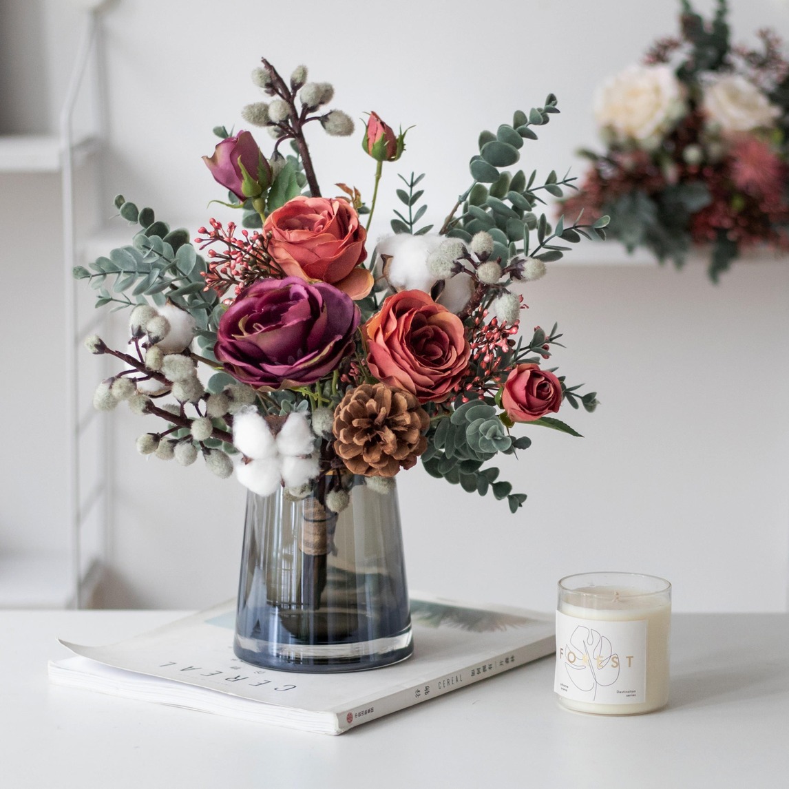 纯白色调的简约风中,搭配色彩艳丽的仿真花束,完完全全占据了整个空间的C位,使整体增添了不少亮色。花束套餐的饱满和丰富程度也提升了质感。