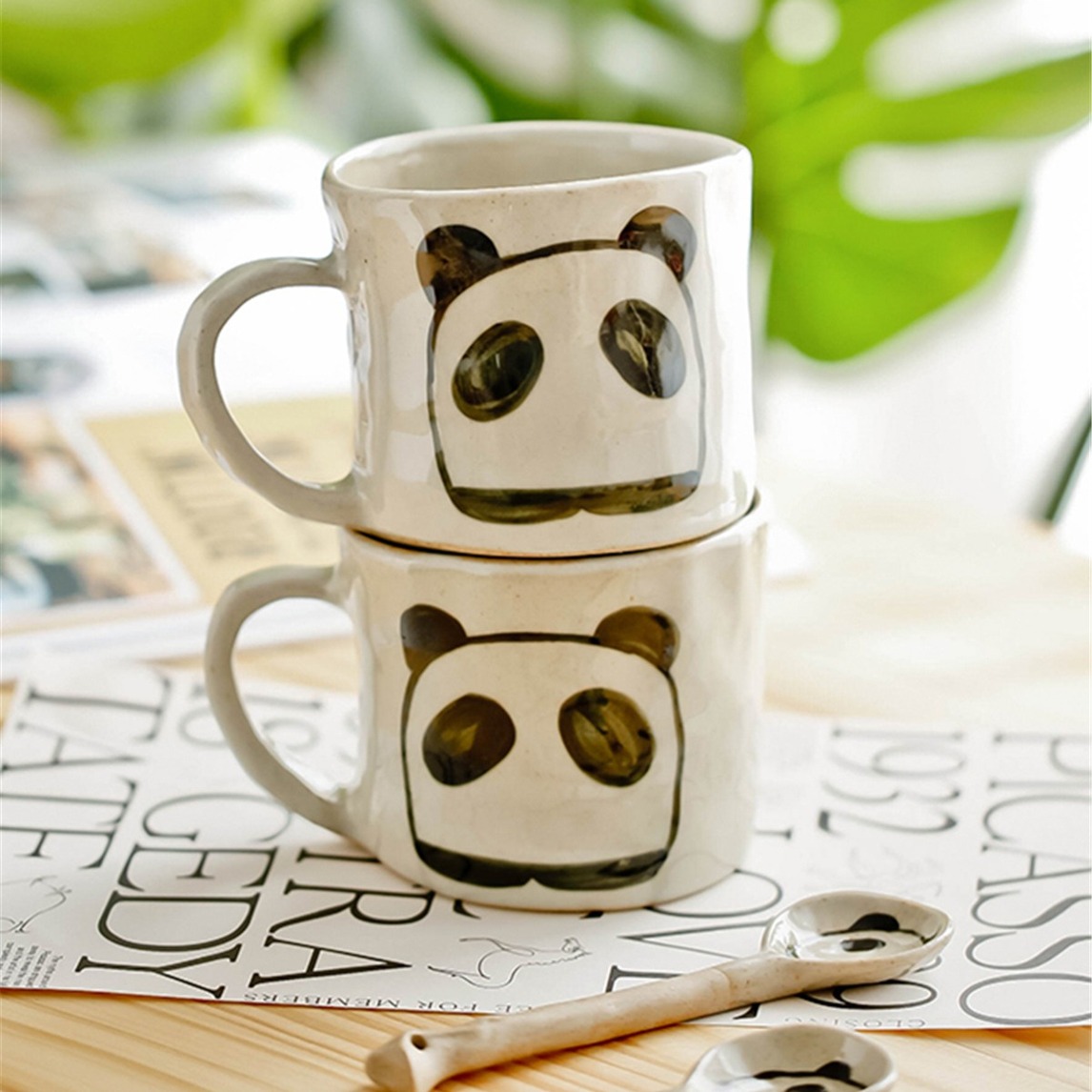 粗陶工艺的陶瓷马克杯,独特的手捏造型,古朴做旧,更显格调;手绘上色的熊猫图案,萌化人心,为餐桌带来有趣的氛围。