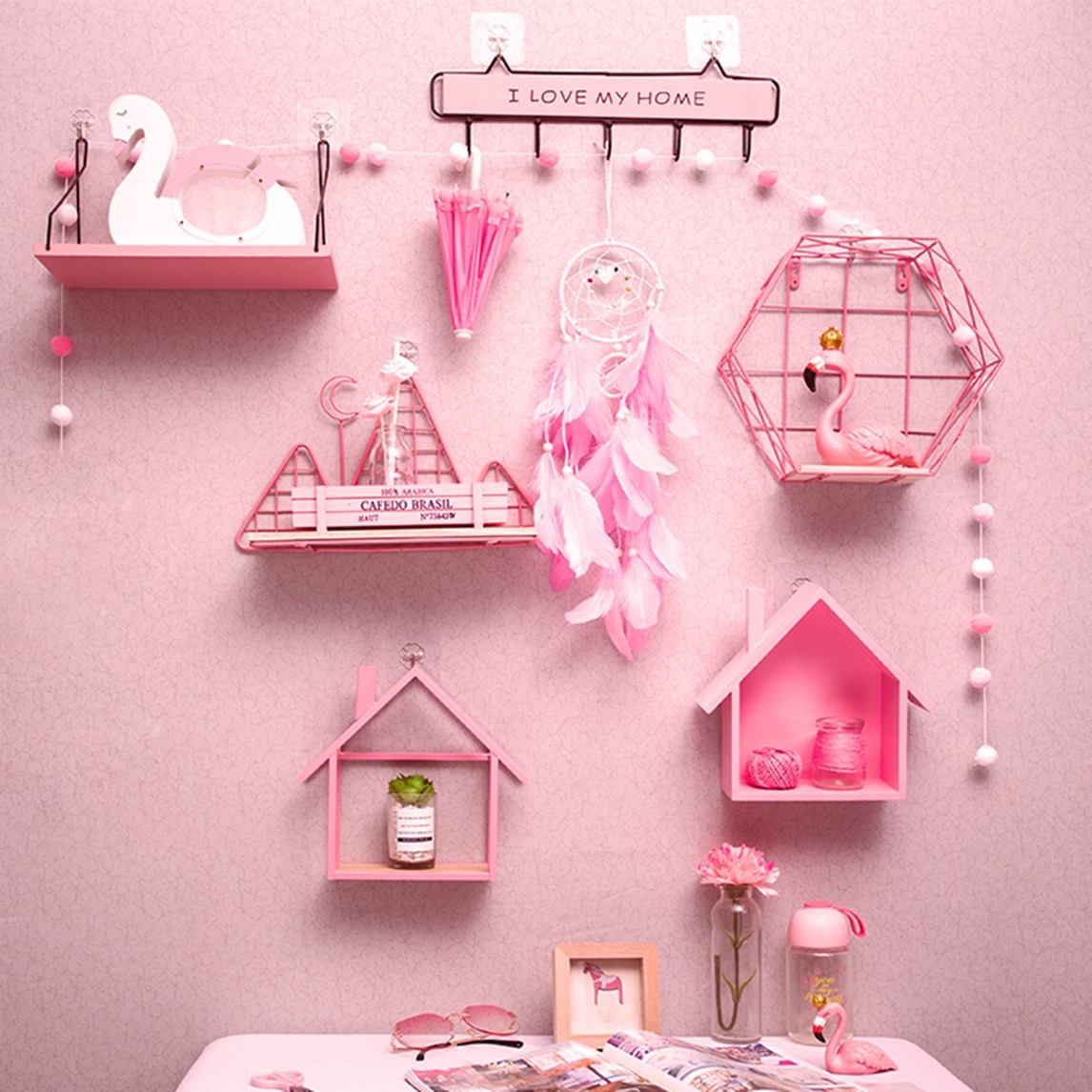 打造一面温馨的网红墙,我们只需要这样搭配就可以了,一个粉色的六边形装饰挂件,一个粉色的置物架,一个粉色的公主房挂件,配上粉红色的墙面,整天布局温馨可爱,满满都是少女心。