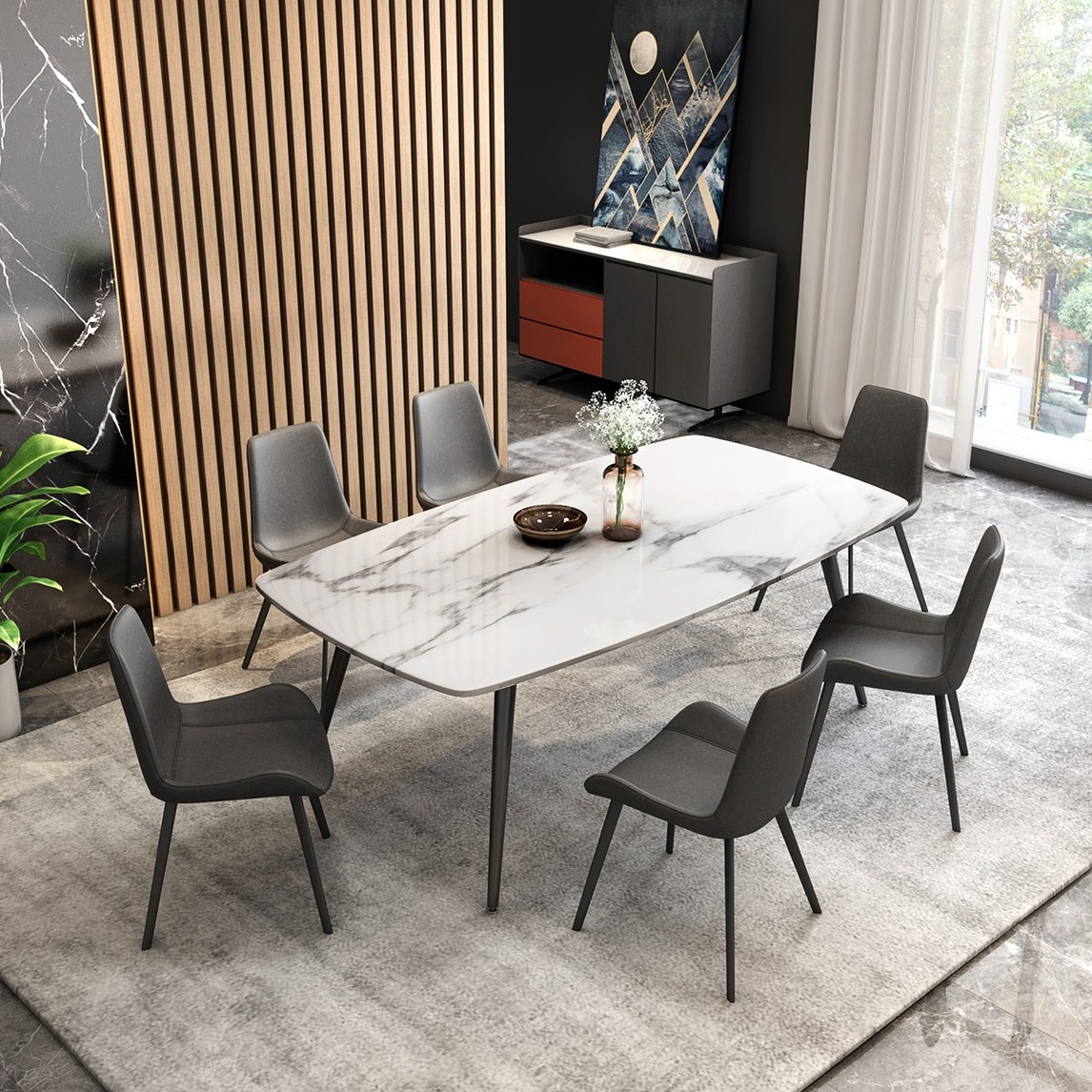 随着动线进入餐厅,皮质餐椅与黑色大理石餐桌的搭配,轻松营造出轻奢优雅的氛围,加上线型黄铜墙壁的运用,让空间既有精致气息又不失温润质感