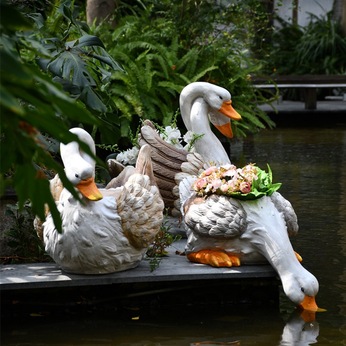 超大的天鹅花盆共三种造型非常好的造景布置,采用石膏材质,形态可爱逼真,再加上一点花艺或绿植,摆在水池边好看极了。