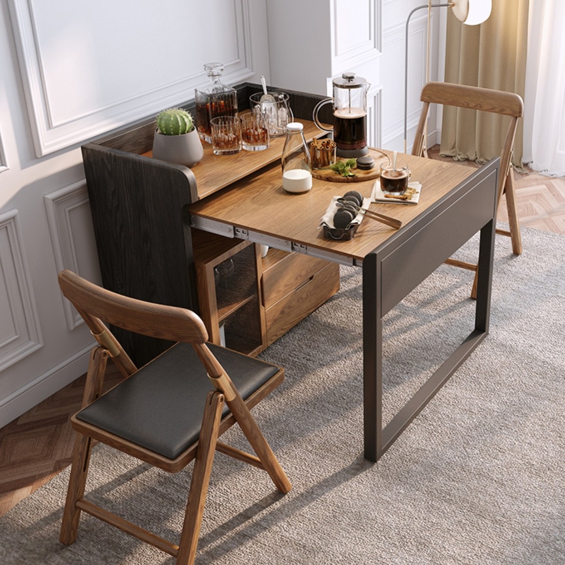折叠餐桌设计,可以更好的利用家中空间,折叠时占地小,伸展开则可以让你安心用餐,操作简单,使用便捷。半开全开两种模式,轻松应对不同用餐人数,朋友小聚也有空间。餐桌餐边柜随意切换,储物收纳也轻松。