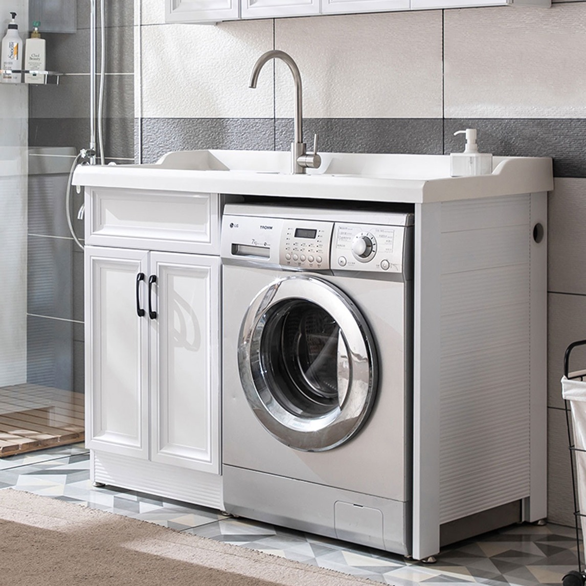 这款卫生间的装修设计主要以节省空间为主,浴室柜一体化,既能让你有洗漱的地方,柜底留出来的空间恰好放置洗衣机,让你的洗衣机不在流离失所。