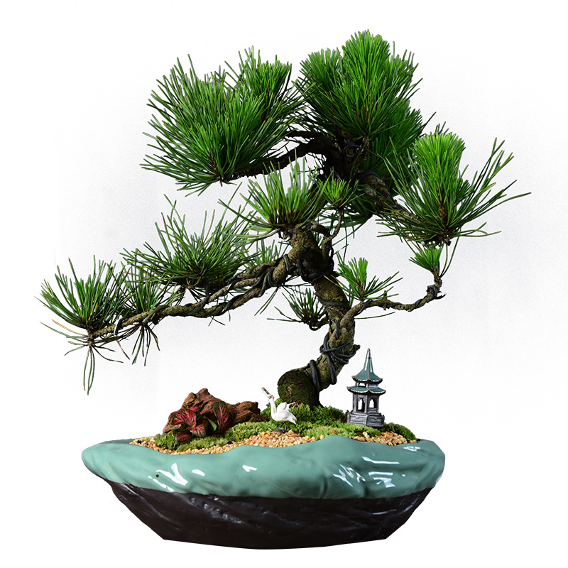 五针松四季常青,茎干风姿秀丽,特别是塑形后更是秀雅美观,配合上苔藓和凉亭摆件的点缀,顿时成为一件艺术品。