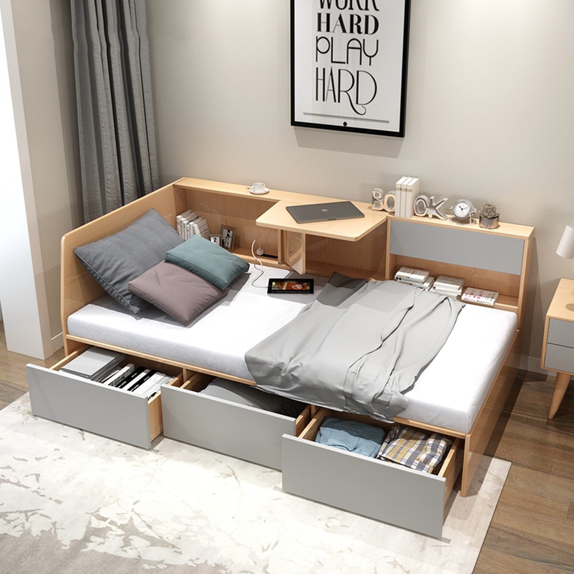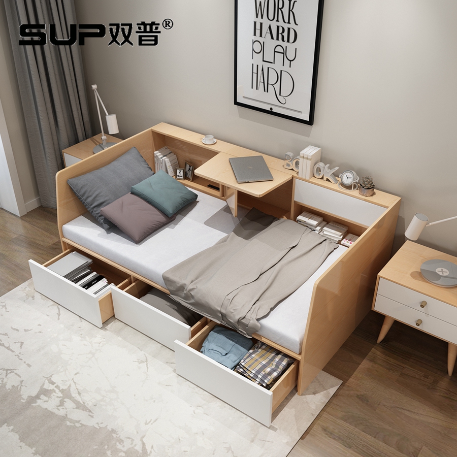 这款单人床超级实用,不仅带有收纳储物的功能,还有超级实用的办公功能,不仅可以当做书房,还可以当做客房哦。