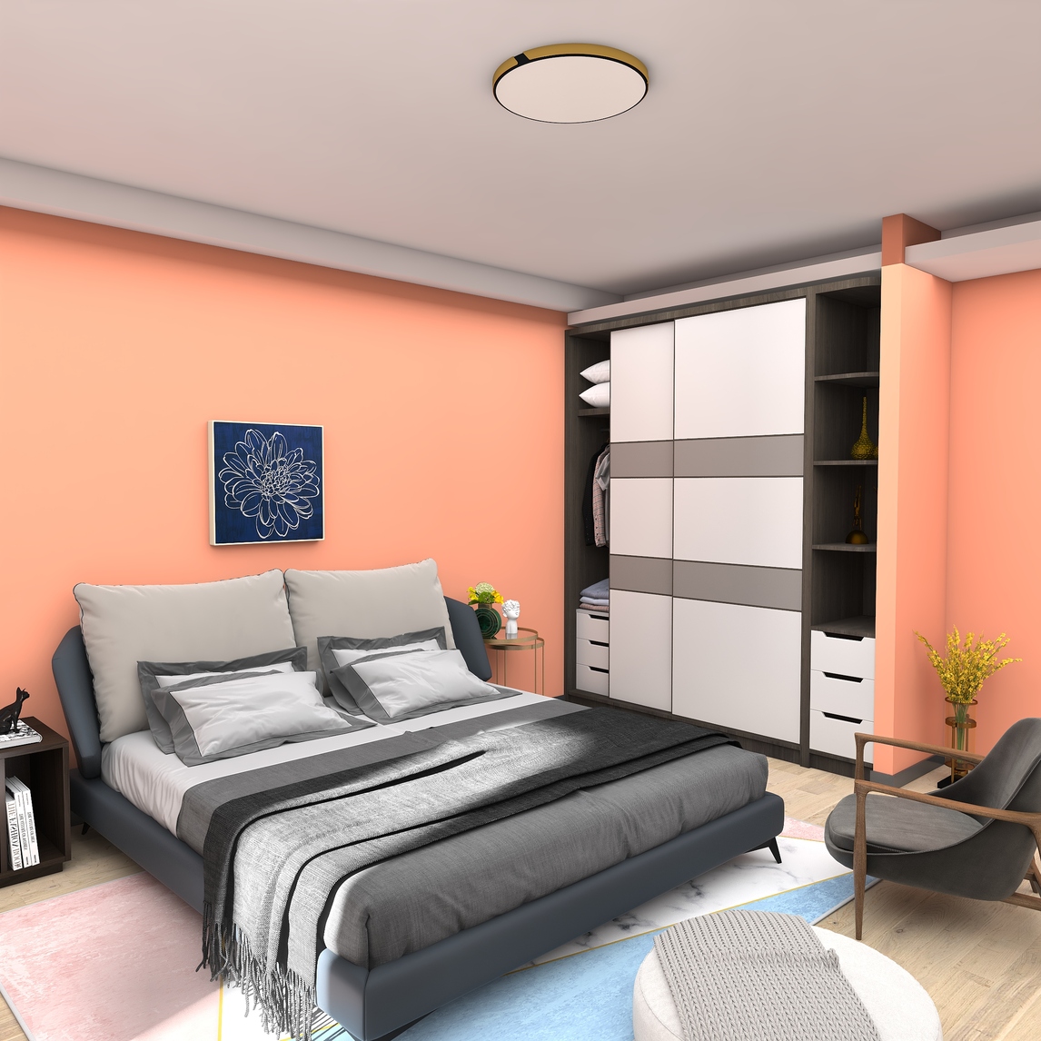 橙色的墙纸搭配灰色布艺床,配上黑金色的轻奢形吸顶灯,简约中透着轻奢。卧室不一定必须搭配吊灯,一盏吸顶灯也可满足要求,在装修的经济预算里,吸顶灯可以省下一笔钱。