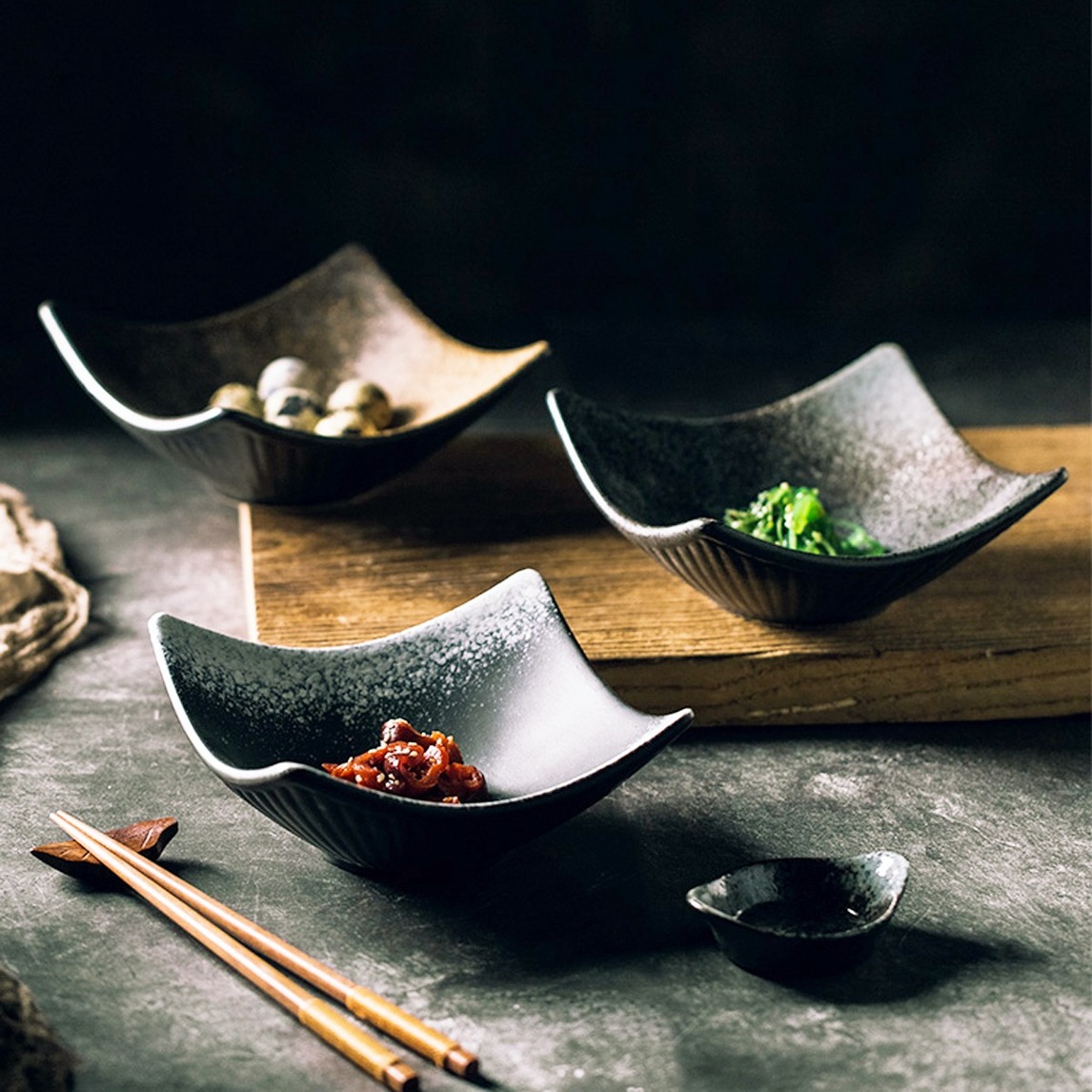 没有那么多的花花绿绿,简简单单的黑色窑变餐具,给人古朴雅致的感觉,独特的四角翘盘设计,装点小吃、点心,又或者别的食物,虽然简单,但也不失品位哦。