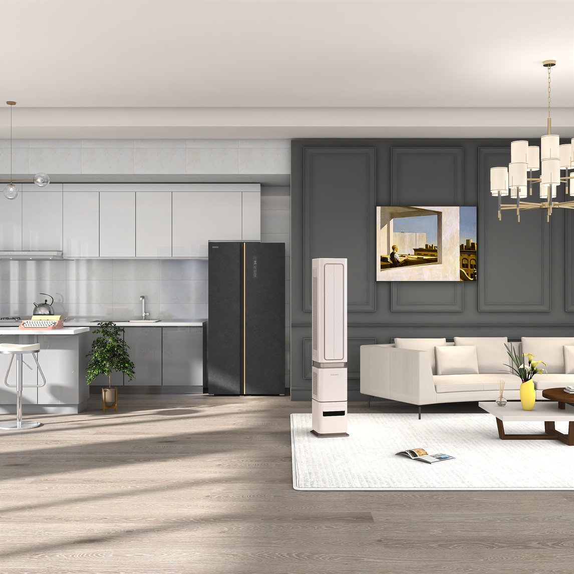 现代轻奢风格的客厅,不仅拥有简约时尚的气质,同时具有奢华的质感。COLMO高端家电,让整个居室环境更加精致,熔幔岩冰箱和雅仕金空调,在整个客厅中尤为亮眼,优雅的外观堪称现代家电美学的典范,让人不由赞叹...展开