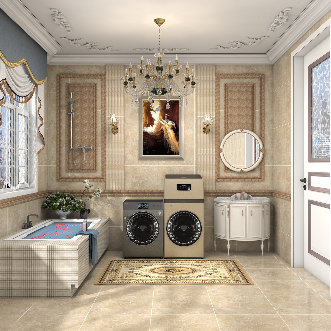 欧式卫浴间,不仅要具有卫浴间的实用功能,还要美观奢华。精致的吊灯、复古的洗手池、高雅的比佛利洗衣机组合等等都充斥着奢华之气。欧式古典主义的画作,点缀在卫浴间中,增加了贵族气质,置身其中,仿佛身在古典的...展开