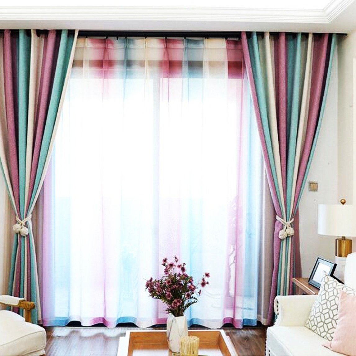 最吸引人的莫过于带着浪漫地中海风情的窗帘了,渐变的色调,显得特别温柔,搭配白色的铆钉沙发,色彩对比明显,迷人耐看。
