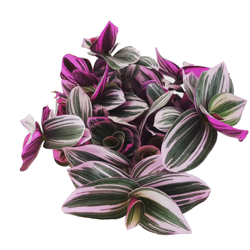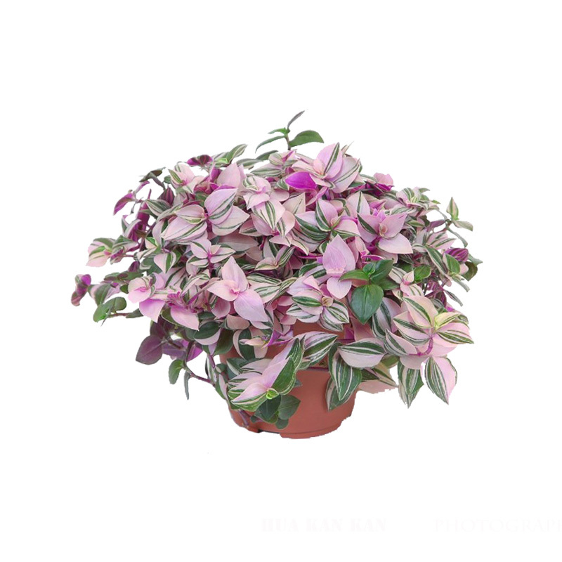 紫露草盆栽,叶子椭圆形,顶端尖,光滑有光泽,带有不规则的绿色、紫粉色、白色条纹或锦斑,气质温婉、梦幻,堪比油画,茎肉质柔嫩无骨,长成藤蔓或垂吊,适当修剪,可以保持矮小株行,做可爱的盆栽绿植。