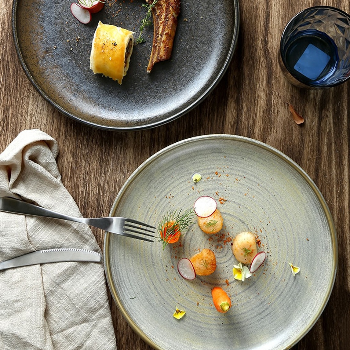 盘子的表层通过高温窑变烧制,所形成的细小的颗粒,搭配内部环形形成深浅调,让盘子更有层次美感。黑白色系,配上美食,各有韵味。