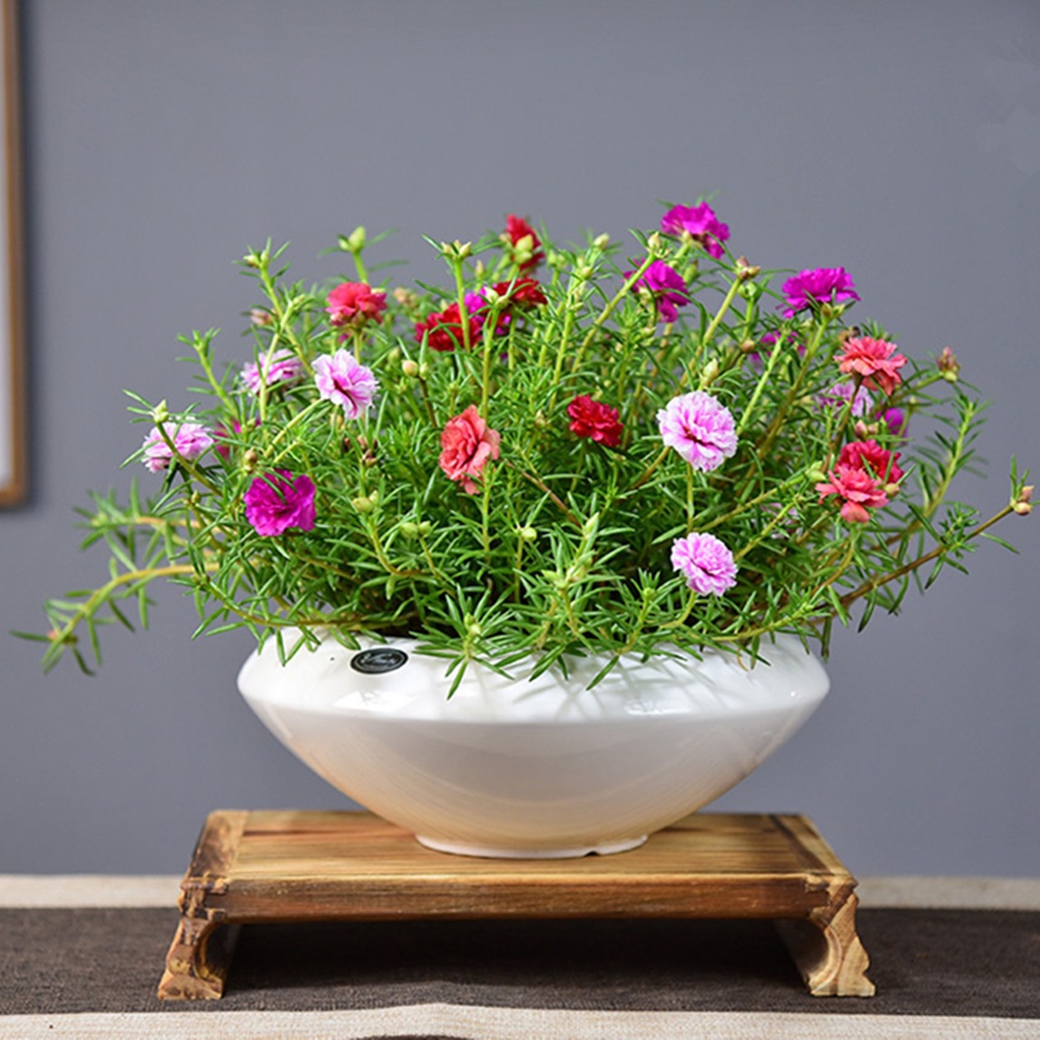 太阳花又称松叶牡丹,花色繁多,叶片细长,花开时朵朵小花在叶尖处绽放,非常漂亮,搭配一个陶瓷花盆,摆放子客厅中非常亮眼。