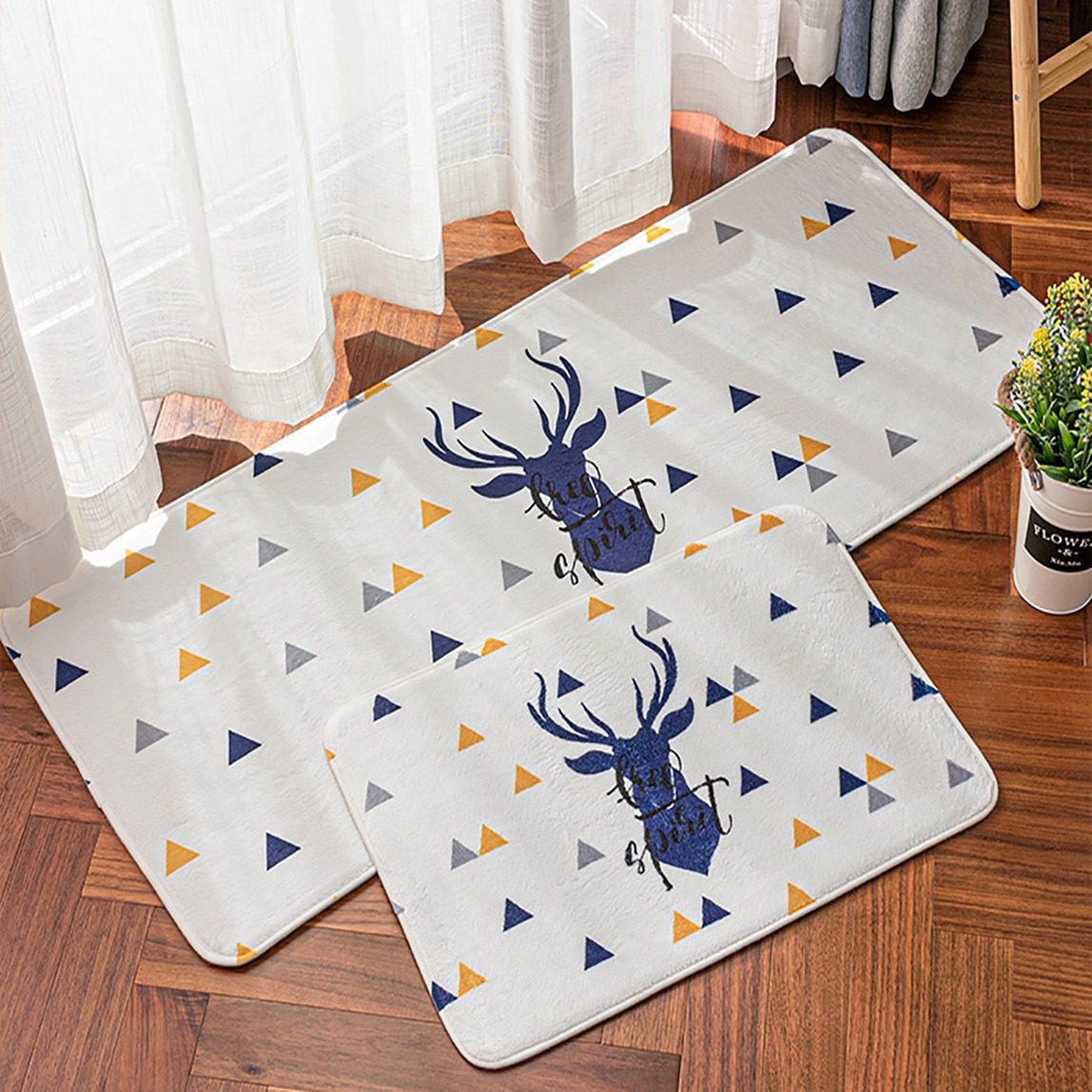 简约大方的入户门垫,细节彰显地垫的品质。多色三角鹿的图案萌趣十足。亲肤柔软舒适的法莱绒,面料加厚,柔软更舒适。底部点塑设计,安全防滑,是入户门首选之垫。