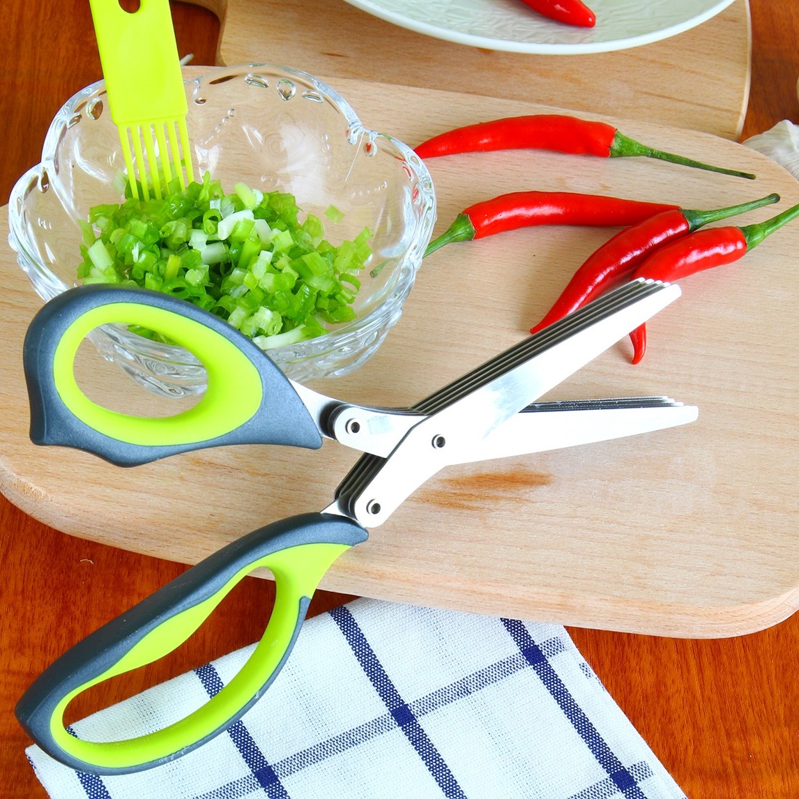 这是一个很实用的厨房剪刀,可以用来剪葱花、香菜、青菜等。5层的设计,不锈钢材质,剪一下,葱花就切好啦!