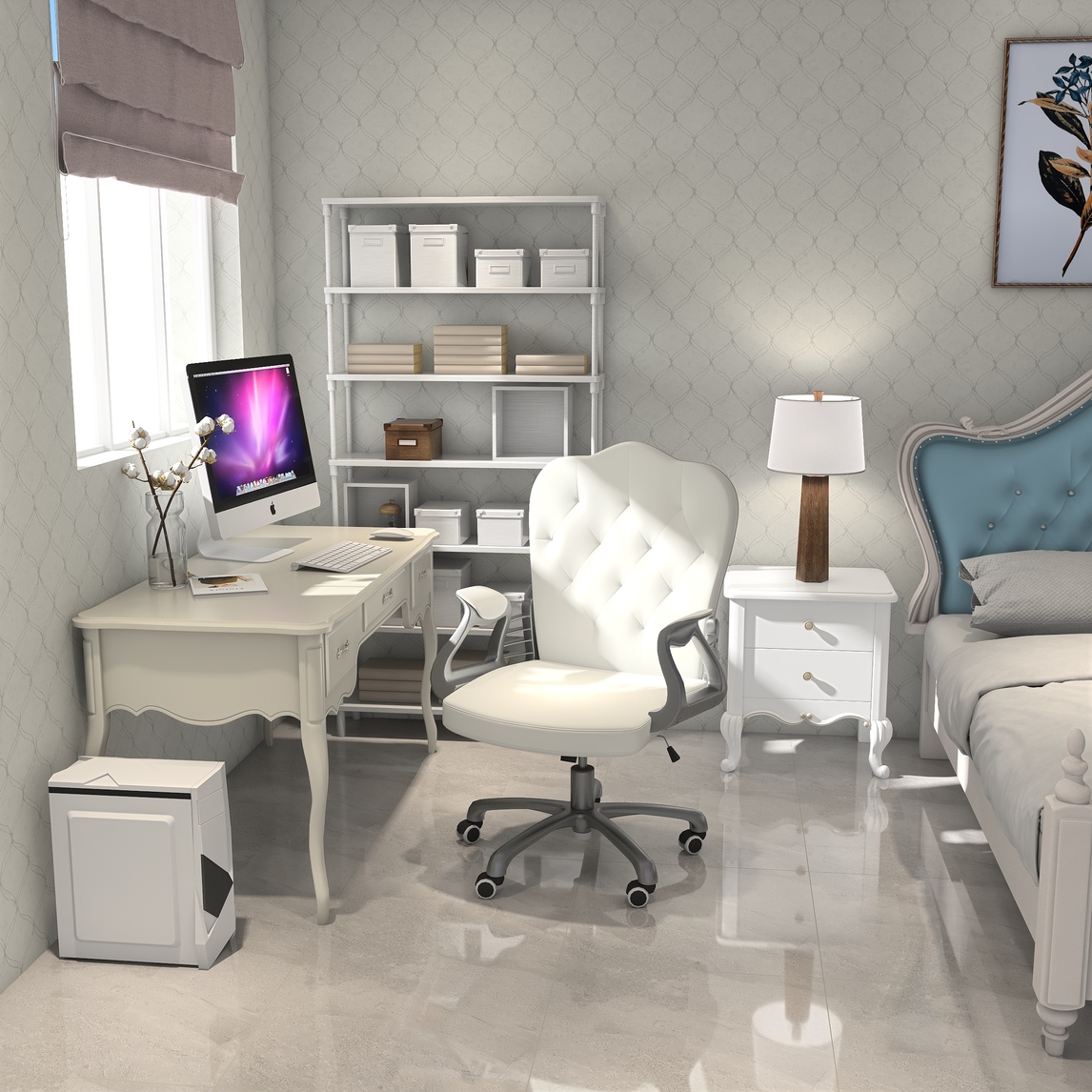 卧室以素雅的白色为主调,将白色印花墙纸贴满墙面,让空间摆脱单调感,提升格调。简欧式电脑桌设立在床的一边,与窗户相邻,便于采光。柔软的皮艺电脑椅,舒适安逸,降低办公疲惫感,辅以书架的摆设,让卧室兼具美感...展开