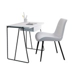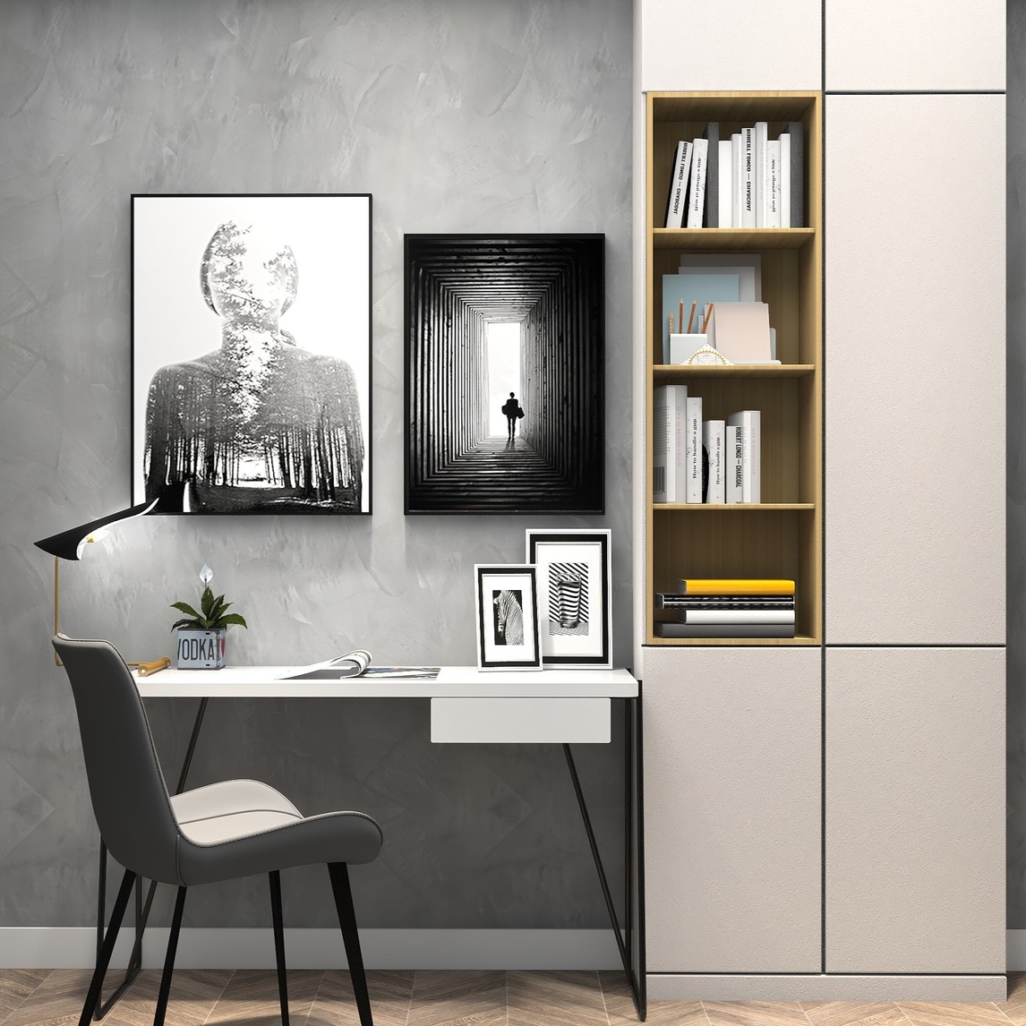 工业风的书房设计。墙面用了混凝土艺术墙漆,书桌选择了极简造型的,带黑色铁艺元素。黑白图案装饰画增加空间气氛,地板和书柜原木细节让空间充满温馨气息。