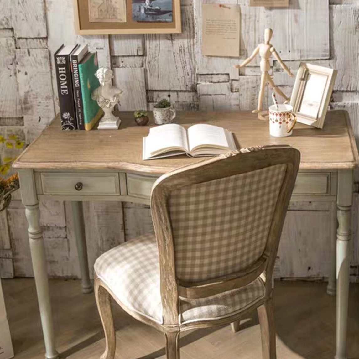 美式复古书桌,让你的书房充满复古气息,采用橡胶木制成,斑白做旧手法,搭配上法式做旧靠椅,让你的书房更具特色。