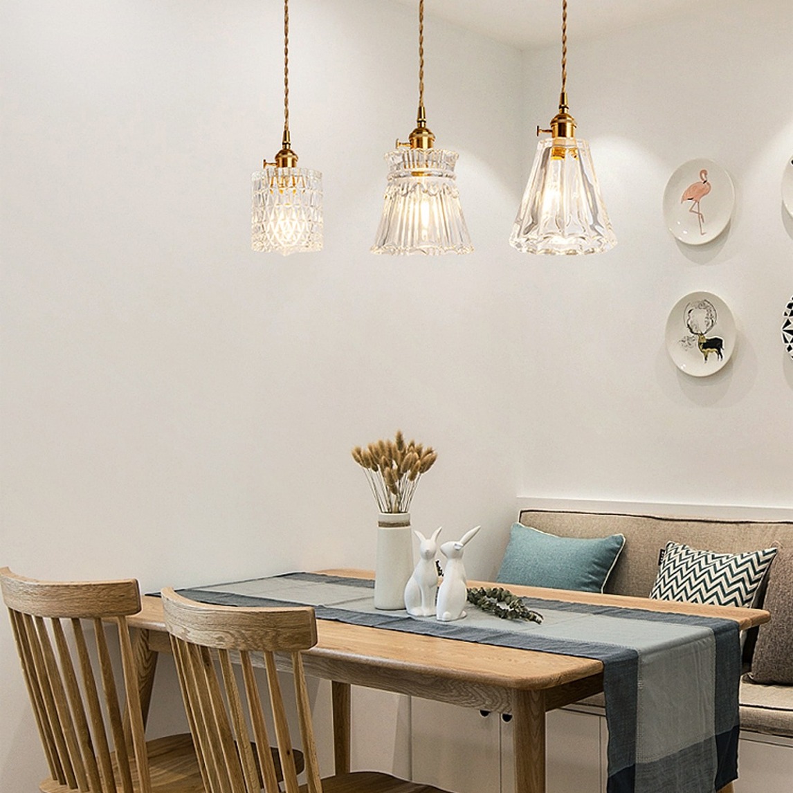 日式风格,总是给人一种素雅简约的感觉,让人觉得非常的舒服,日式的玻璃小吊灯,加上原木色餐桌椅组合,超级好看呀。