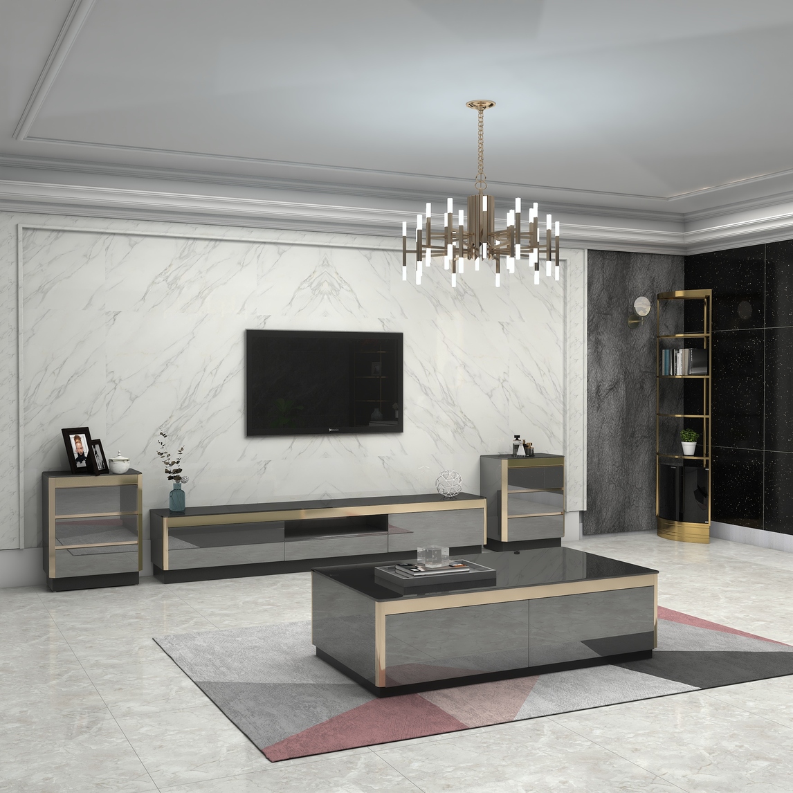 本次设计是后现代轻奢,简约茶几电视柜组合,后现代意式北欧大理石玻璃面茶几,搭配同款斗柜,空间显得和谐高档。