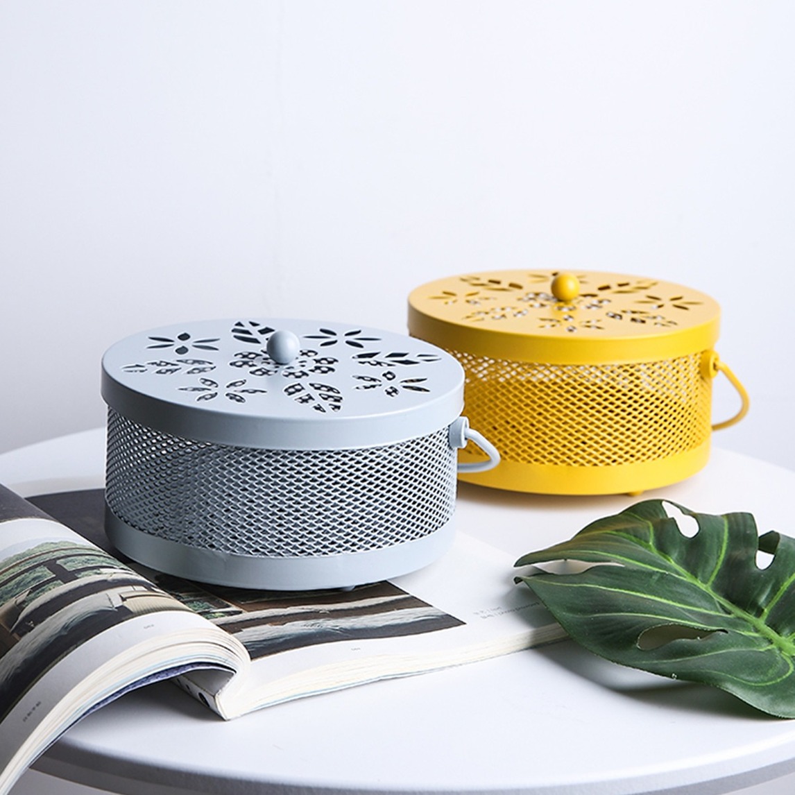 在使用蚊香驱蚊时,因蚊香灰掉落下来会有明火且不易清理,存在着火险隐患,这个精美的铁艺蚊香盒,蚊香盒盖上分布了很多大小均匀的圆孔,这样可便于蚊香烟的散出,并且还起到了防火作用
