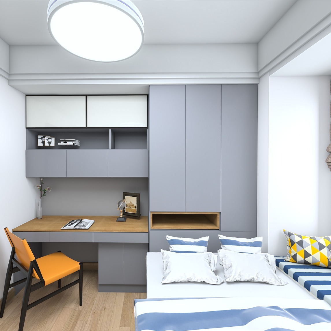 业主是位20多岁的理工男,要求简单自然舒适。房间空间不大,定制榻榻米的设计优点是功能齐全,可以休息,可以办公,可以玩游戏,加上榻榻米上方的大衣柜,书柜都有。灰色的主色调,安静美好的氛围。书桌的桌面用木...展开