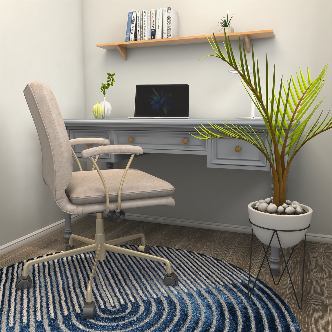 使用了暖色加冷色的对比,让书房的简单与干净气氛来帮助你更快更沉浸的进入到工作或者阅读的情境下去,让工作变得更加有效率。