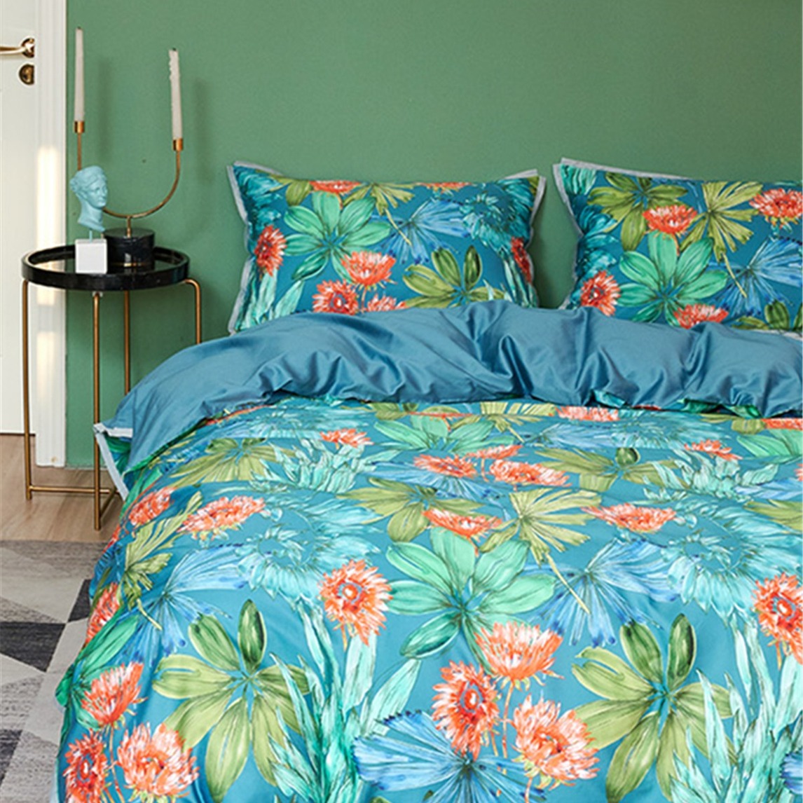 偏蓝色调的四件套加入花卉装点,带来田园风的景色,让房间十分贴近大自然又不失高雅格调;60支全棉材质制作,丝滑的质感,柔软舒适。