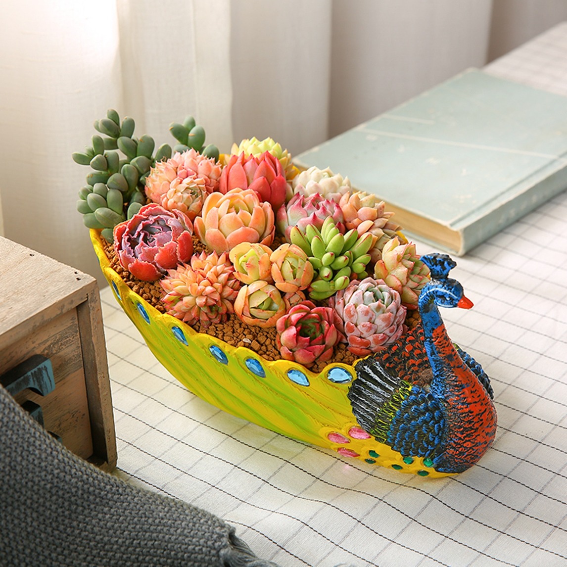 书房里摆放的一盘孔雀多肉拼盆非常的亮眼,栩栩如生的孔雀造型,搭配上状态非常好的多肉,美感十足,将书房装点的惊艳无比。