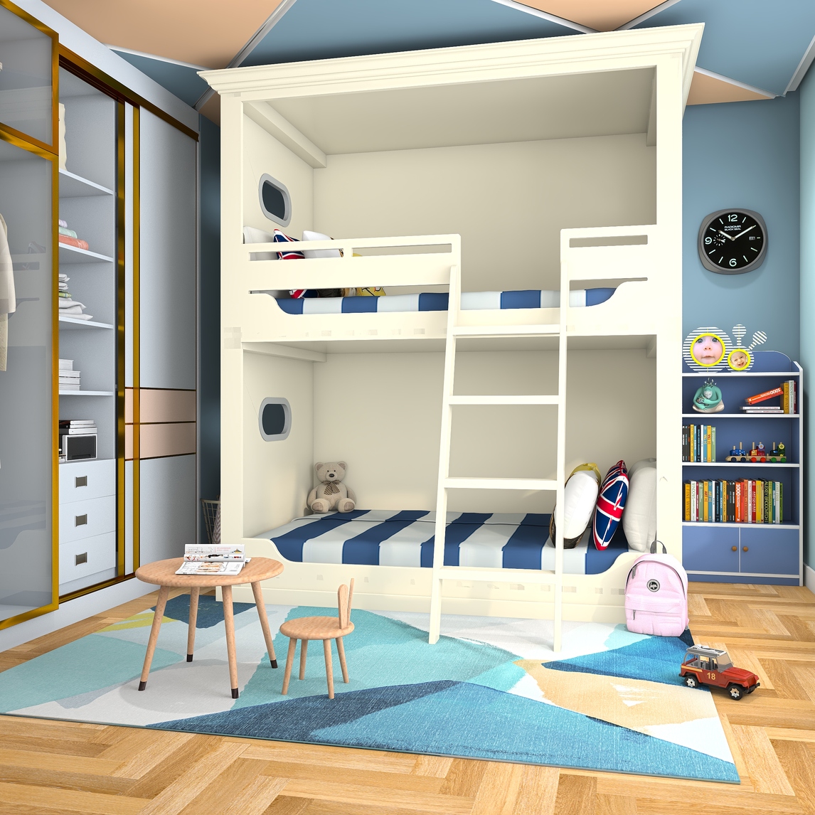二胎时代,房间的数量上面可能达不到,所以在房间的利用上面尽量大利用,这个儿童房采用北欧风格,运用上下铺为主,不仅在硬装墙面采用护墙板防止墙面污染。还在整个运用暖灰系色彩,让儿童房又高端好看